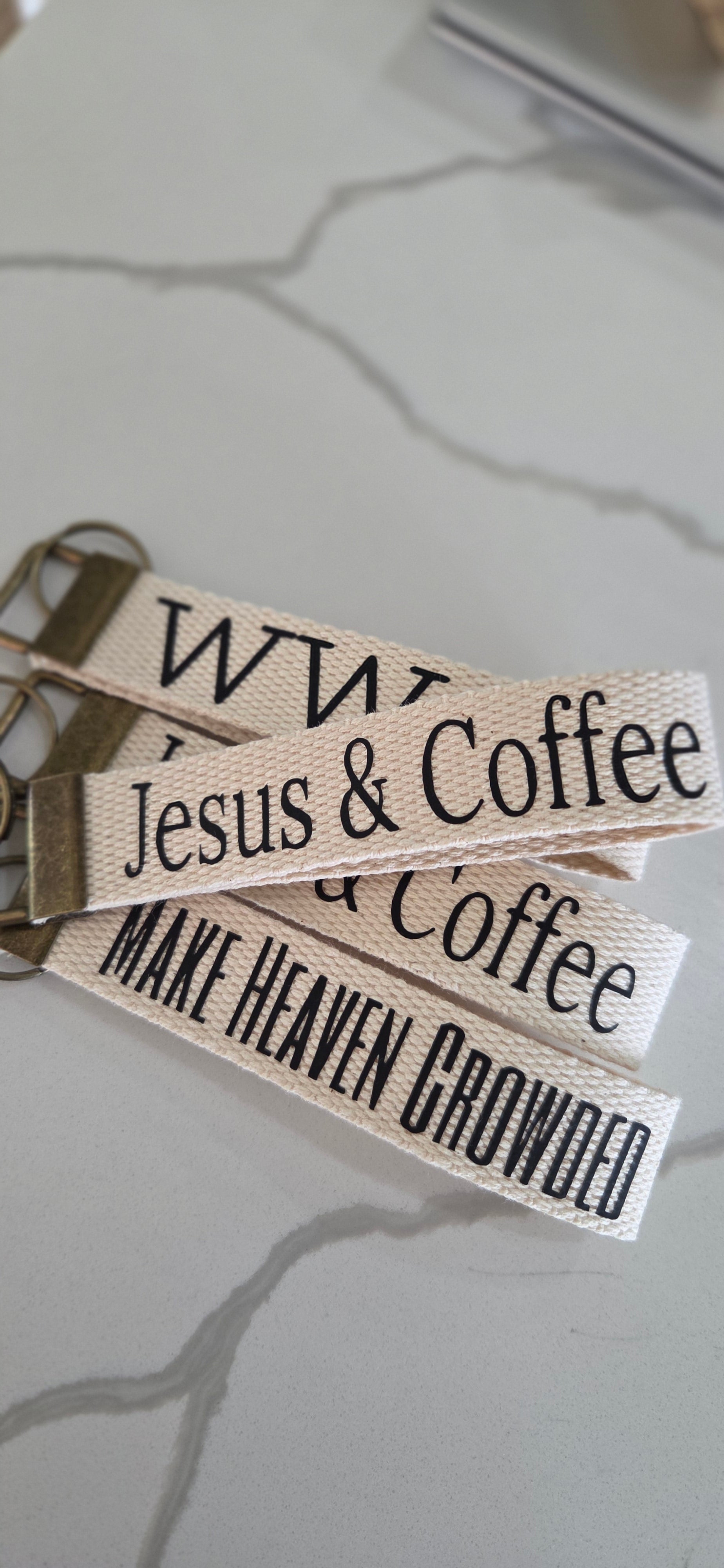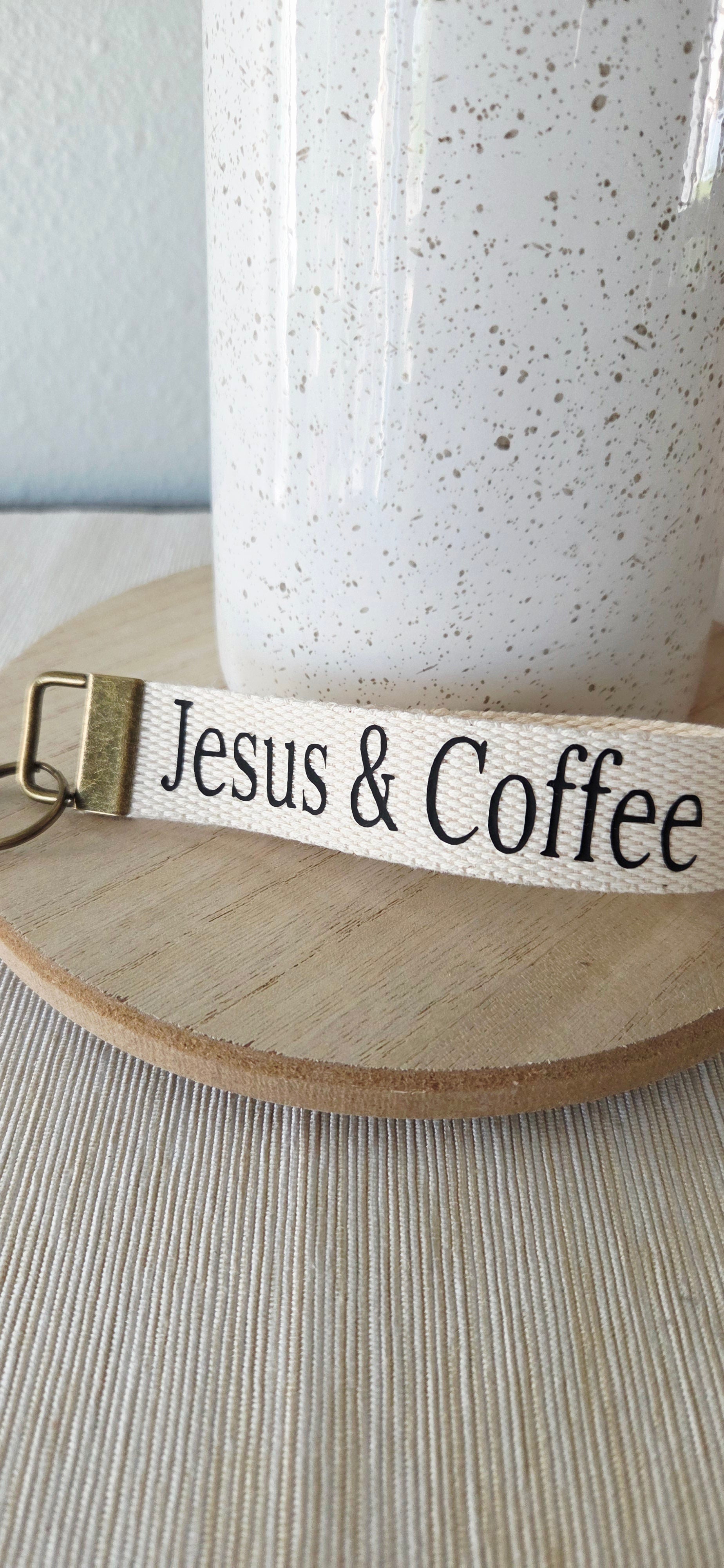 Start your day with faith and your favorite brew! Our Jesus & Coffee Key Fob Wristlet is a stylish, faith-inspired accessory designed for convenience and encouragement. Handcrafted from 100% cotton webbing for durability and comfort, it features premium bronze key fob hardware for a timeless touch. Available in white or black, this Christian wristlet keychain keeps your keys secure and your hands free—perfect for busy mornings, errands, or gifting to a coffee-loving friend. Whether you’re running to church, work, or your favorite coffee shop, this key fob is a daily reminder to keep Christ at the center.